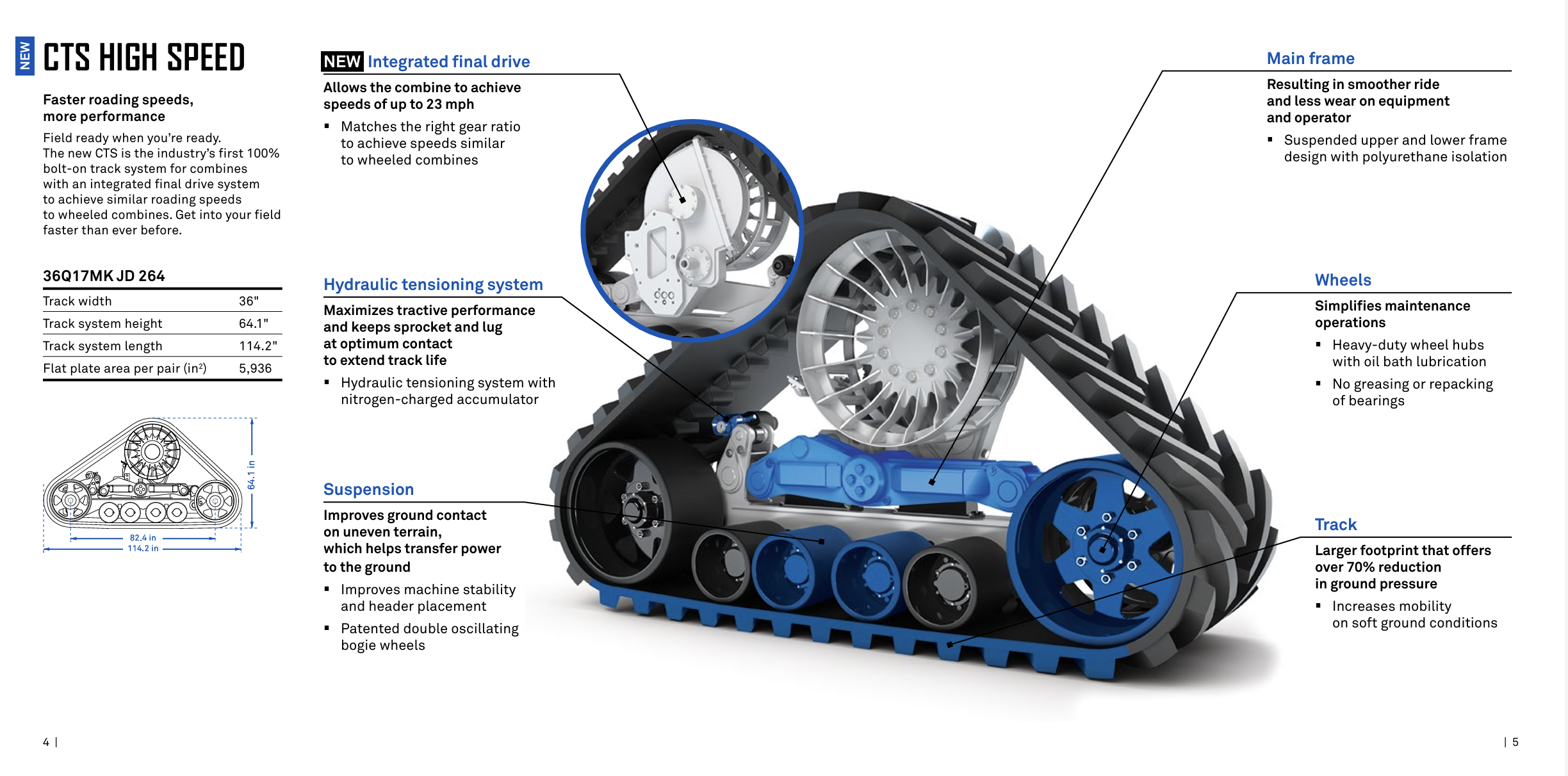 Most aftermarket combine tracks are an insurance clause which allow you to be in the field in wet conditions. They often slow the speeds down by 50%, add weight to final drives which ruins them, and rattle the heck out of the machine and operator. These are not that type of product.